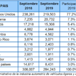 En septiembre de 2019 los vehículos mexicanos representaron el 17.3% del total de vehículos ligeros vendidos en Estados Unidos, mientras que en el acumulado enero-septiembre 2019 se exportaron 2,038,451 unidades, las cuales representan el 16.0% del total de las ventas de vehículos ligeros en dicho país en lo que va del año.