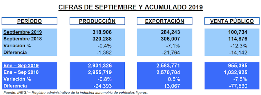 Durante el noveno mes del 2019 se produjeron 318,906 vehículos ligeros, registrando una caída de 0.4% en comparación con las 320,288 unidades producidas en el mismo mes de 2018. En el acumulado enero – septiembre 2019 se registraron 2,931,326 vehículos producidos, 0.8% por debajo de las unidades producidas en el mismo periodo de 2018.