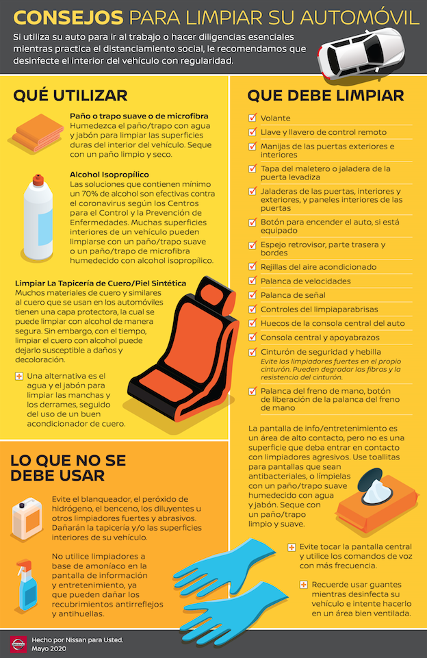 “La mayoría de las personas continúan utilizando sus vehículos, ya sean empleados esenciales que se trasladan diariamente al trabajo o aquellos que van al supermercado por sus compras esenciales”, dijo Ryan Fulkerson, director de Ingeniería de Nuevos Modelos de Nissan Norteamérica. “Queremos asegurarnos de que estén informados sobre cómo mantener mejor desinfectado su vehículo”.