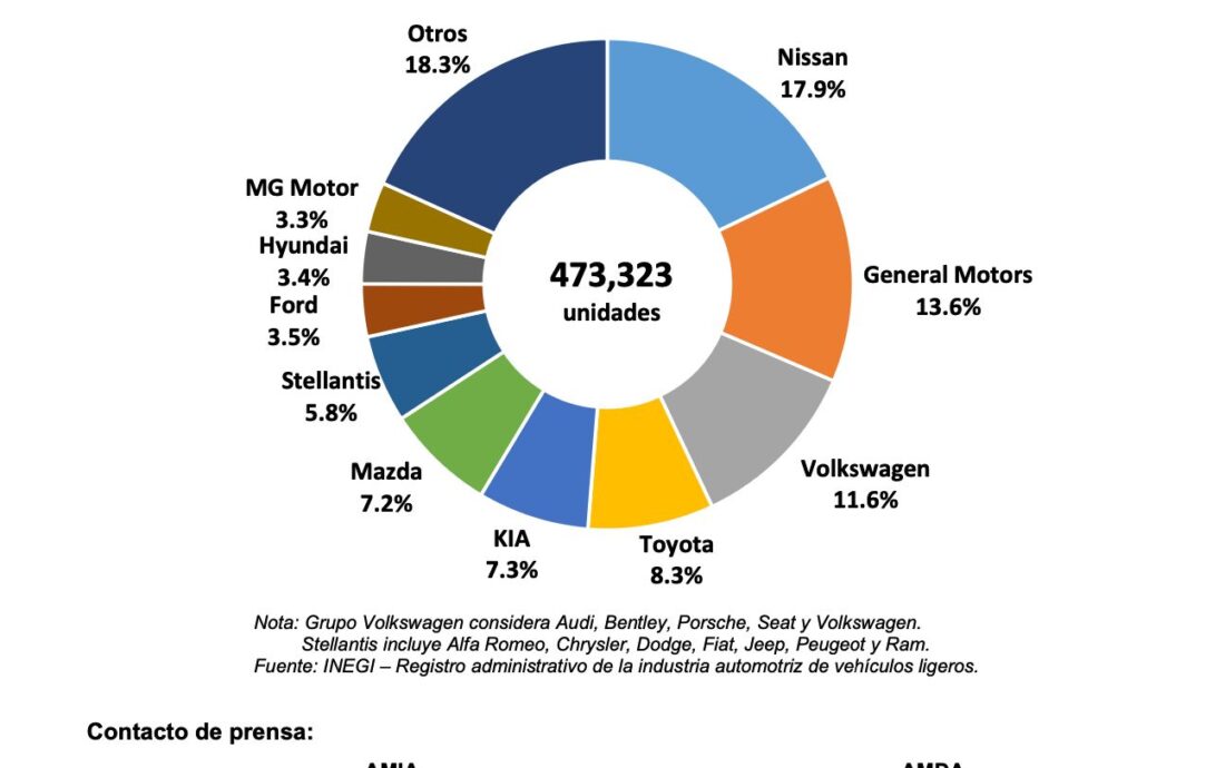 El reporte, difundido por la Asociación Mexicana de la Industria Automotriz (AMIA) y la Asociación Mexicana de Distribuidores de Automotores (AMDA), detalla las ventas por marca. Entre las marcas con mayor participación de mercado se encuentran Nissan (17.9%), General Motors (13.6%) y Volkswagen (11.6%).